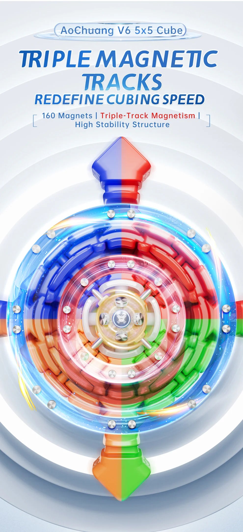 MoYu AoChuang V6 5x5 Single-Track (Magnetic) packs a punch with 96 factory-installed magnets, a compact size (60.5mm), a ball-core, and other mechanism improvements!